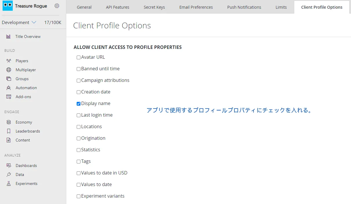 首先,你必須先在 PlayFab 中設定好讓 API 可以存取玩家個人檔案的權限。